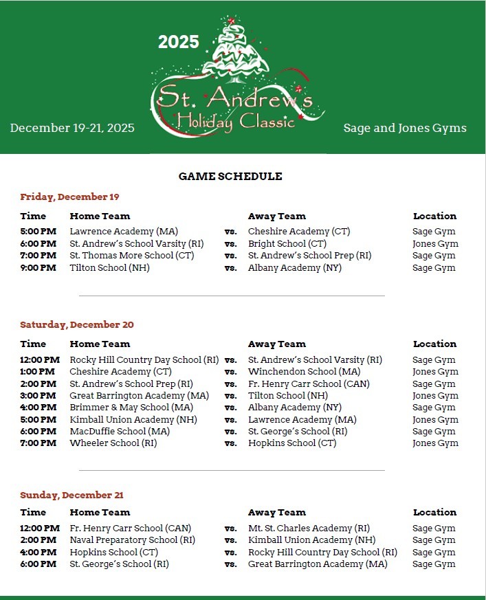 In the deep tradition of holiday basketball tournaments and showcases, the St Andrews School of Barrington, RI annual Holiday Classic has "must-participate" status for many the New England high level prep school teams. Blessed with the advantage of a central New England location, a convenient double gymnasium set-up and a very experienced host in St Andrew's Athletic Director/Men's Basketball Coach, Mike Hart running it, the event is truly a "classic".